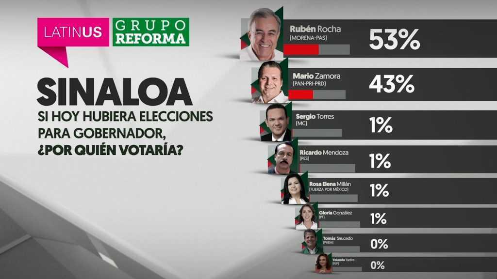 Según dicha encuesta, si las elecciones fueran hoy, 53 por ciento de los sinaloenses votaría por Rocha Moya, 10 puntos porcentuales arriba de Zamora Gastélum, quien tiene 43 por ciento de las preferencias, mientras que mucho más abajo están Sergio Torres Félix, de Movimiento Ciudadano (MC); Ricardo Arnulfo Mendoza, de Encuentro Solidario (PES); Rosa Elena Millán, de Fuerza por México; y, Gloria González Burboa, del Partido del Trabajo (PT), todos con apenas 1 por ciento de las preferencias electorales.