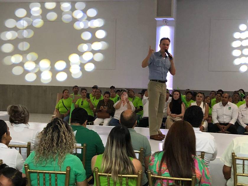 CULIACÁN._ Manuel Velasco Coello, aspirante a la Presidencia, impartió una asamblea informativa ante sus simpatizantes en Culiacán al interior de un salón de eventos que lució inundado por playeras y banderines verdes alusivos a su partido político.