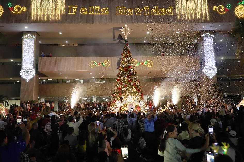 El árbol porta sus tradicionales luces navideñas que fueron encendidas por el Gobernador Rubén Rocha Moya en un evento que contó con show musical.
