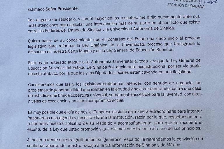 Se trata de la segunda solicitud de intervención que dirige Lizárraga Otero al mandatario federal, la anterior fue el 31 de julio a través de las plataformas de Comunicación Social de la casa de estudios.
