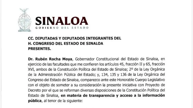 El Gobernador de Sinaloa Rubén Rocha Moya presentó ante el Congreso del Estado una iniciativa con proyecto de decreto para reformar diversas disposiciones de la Constitución Política del Estado en materia de transparencia y acceso a la información pública, con el objetivo de armonizar el marco jurídico local con la reforma constitucional federal publicada el 20 de diciembre de 2024 en el Diario Oficial de la Federación.