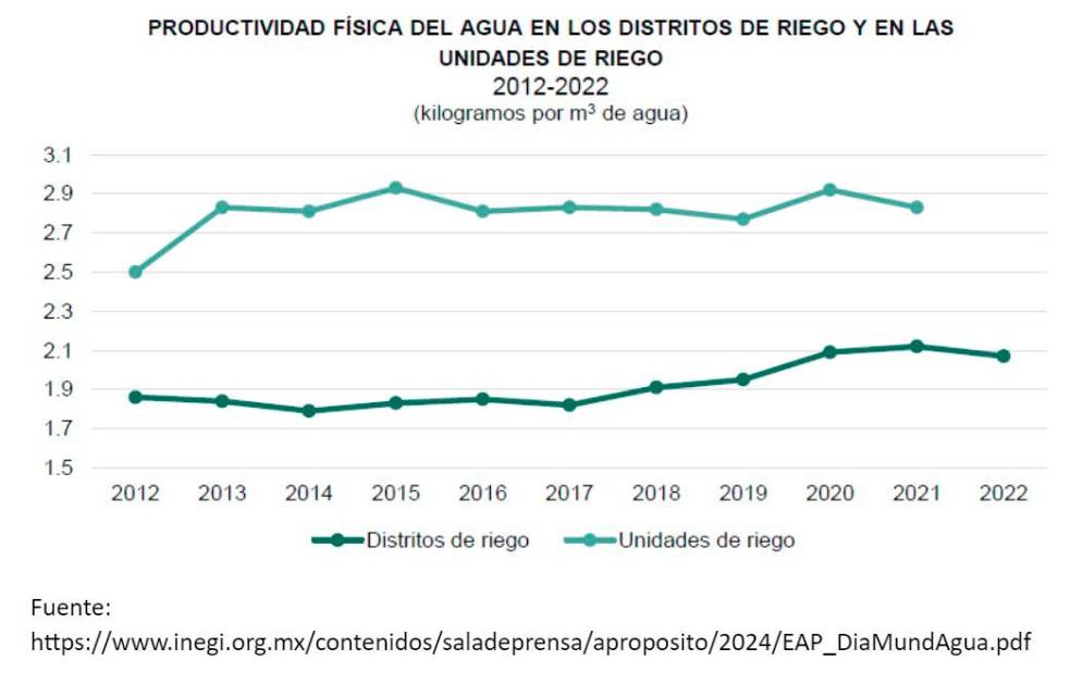 A medida que los sistemas de irrigación se han tecnificado, el aprovechamiento del agua para la producción de alimentos ha aumentado. Para conocer el comportamiento anual de la productividad física del agua en los distritos y unidades de riego, se evalúa la eficiencia de un metro cúbico de agua extraída de las fuentes de abastecimiento en la producción agrícola bajo riego.