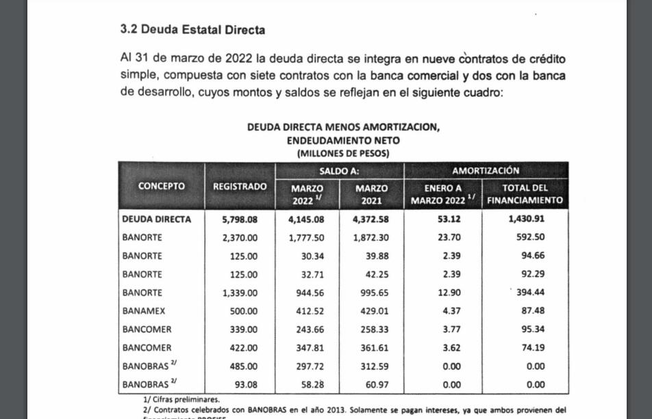 “Al 31 de marzo de 2022 arrojó un saldo de 4,145.08 millones de pesos, presentando una disminución en términos reales de 11.78% respecto al saldo del mismo día del año inmediato anterior; esta disminución se debió a una disminución en términos reales del 11.82% de la deuda contratada con la banca comercial y 11.31% con la banca de desarrollo”, agrega.