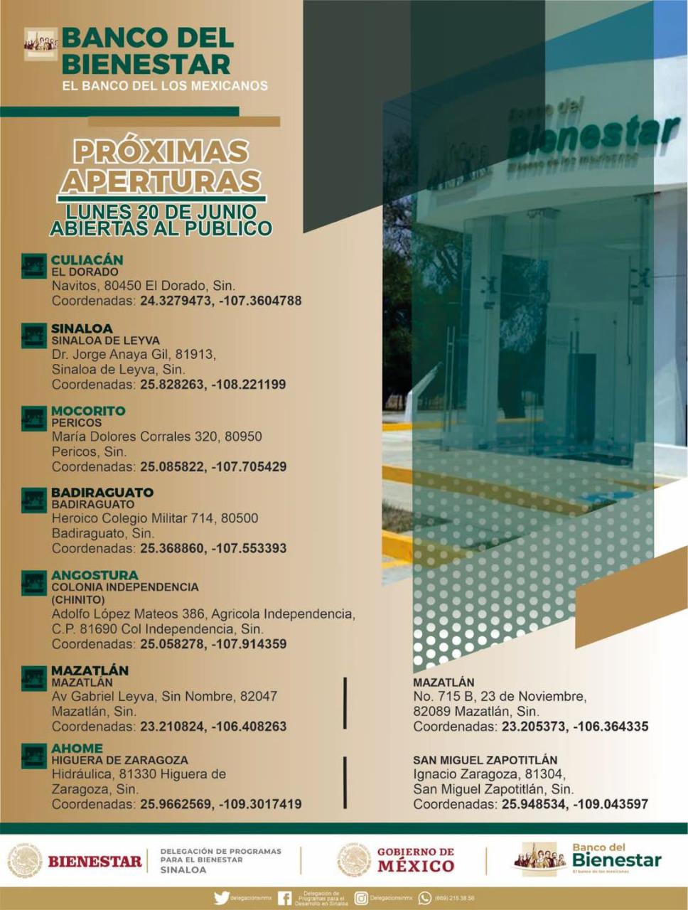 De acuerdo con información de la Secretaría del Bienestar, las demarcaciones en las abrirán las sucursales son Ahome con dos nuevas sedes, Angostura, Sinaloa, Badiraguato, Mocorito, Culiacán y Mazatlán con dos bancos. Estas se sumarán a las tres que fueron inauguradas el pasado mes de febrero, la de Bachigualato en Culiacán, así como Chinobampo y El Carrizo en Ahome.