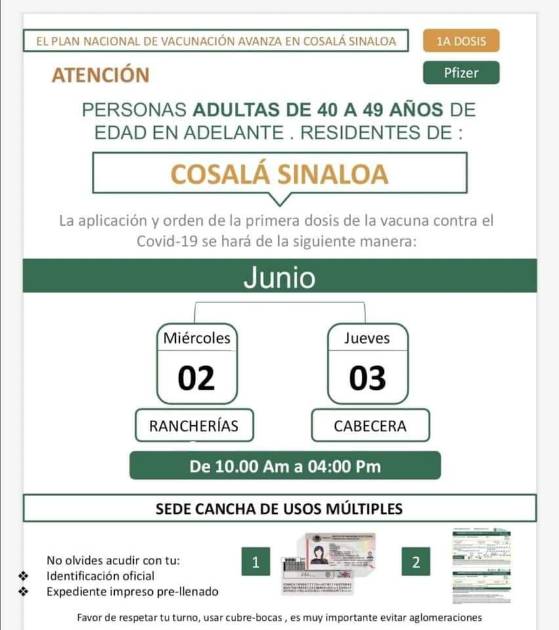 De acuerdo a la logística de la Delegación de Programas para el Desarrollo en Sinaloa, este próximo martes 2 y miércoles 3 de junio se llevará a cabo la jornada de vacunación contra Covid-19 en personas de 40 a 49 años.