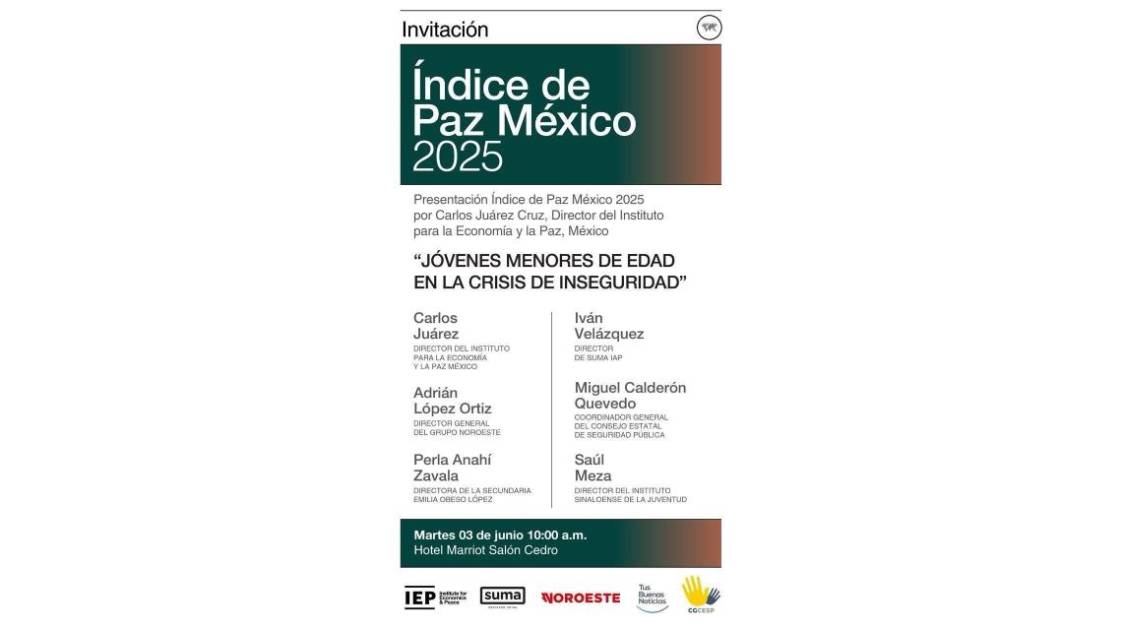 Carlos Juárez Cruz, director del Instituto para la Economía y la Paz en México, presentará en Culiacán los resultados del índice de Paz México 2025, bajo el enfoque “Jóvenes menores de edad en la crisis de seguridad”.