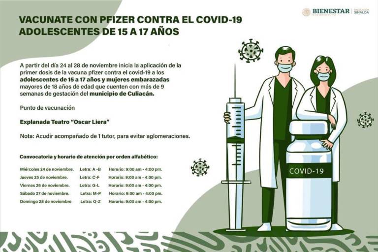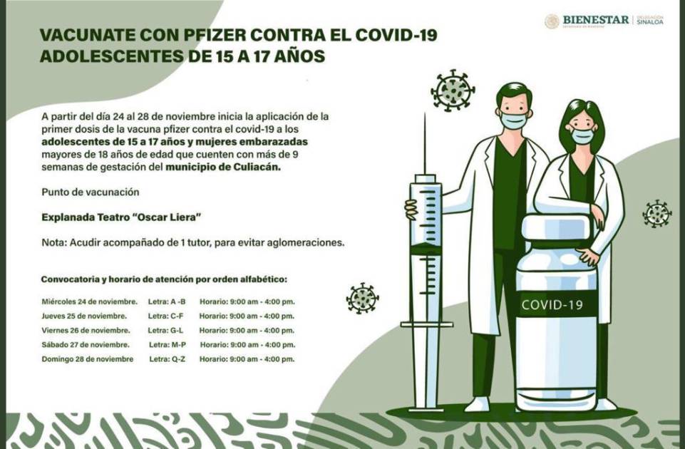 Este miércoles 24 de noviembre iniciará en Sinaloa la vacunación contra el Covid-19 de adolescentes de 15 a 17 años de edad, anunció la Secretaría de Salud estatal a través de un comunicado de prensa.