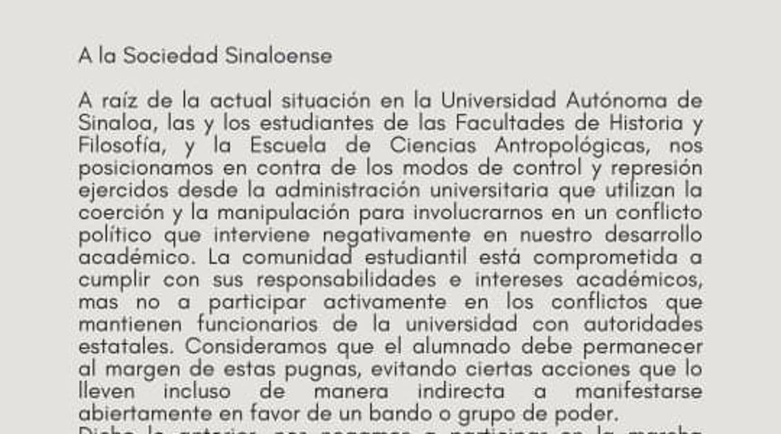 Uno de los universitarios involucrados proporcionó a Noroeste un comunicado en el que rechazaron asistir a la marcha estudiantil y reprobaron el paro de labores.