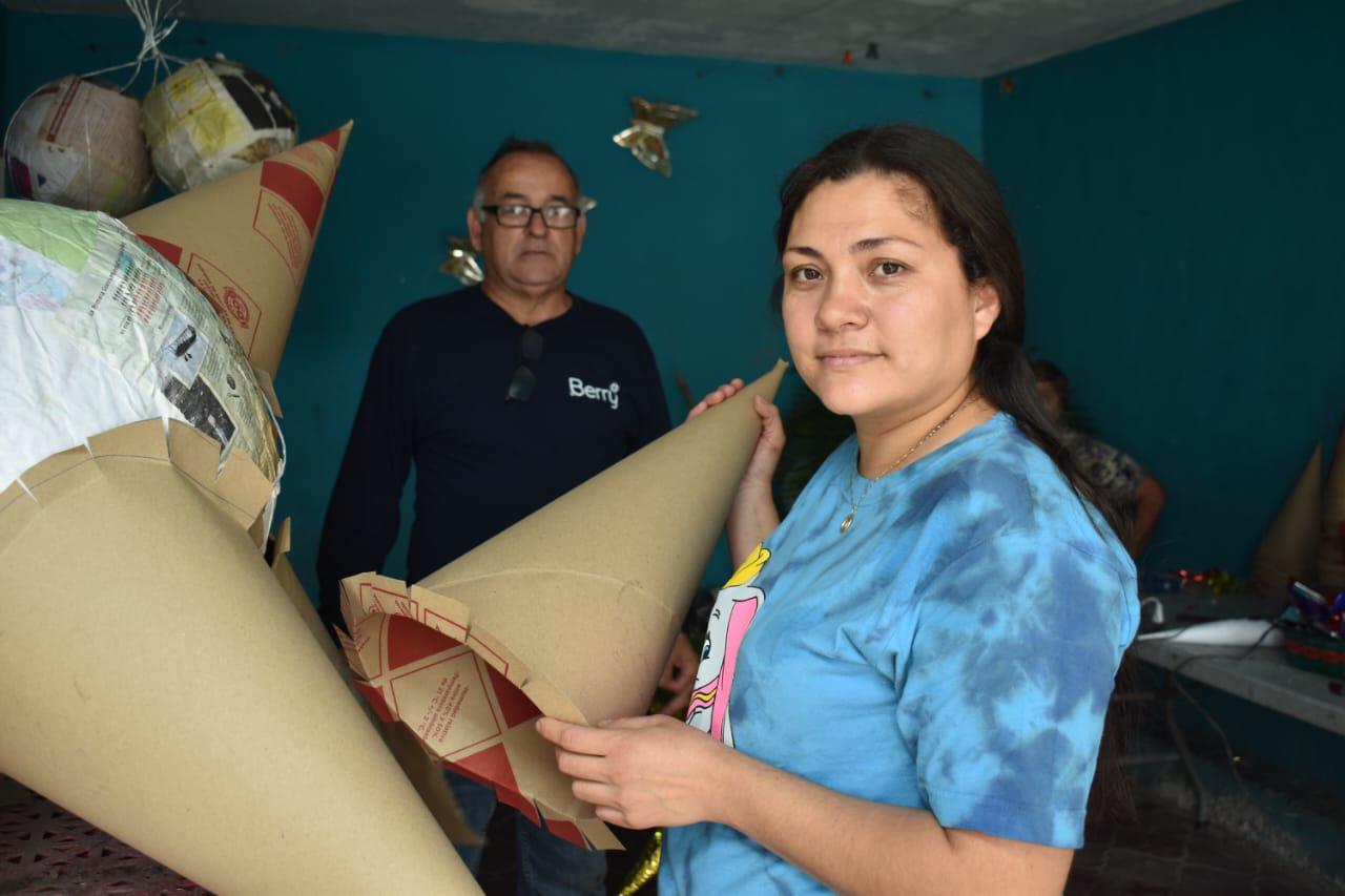 La pareja arma primero el centro de las piñatas, después los conos y cuando llega diciembre las decoran.