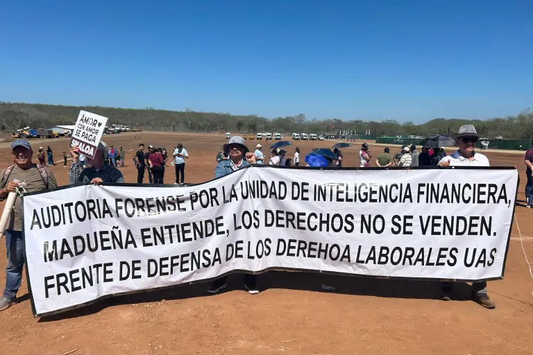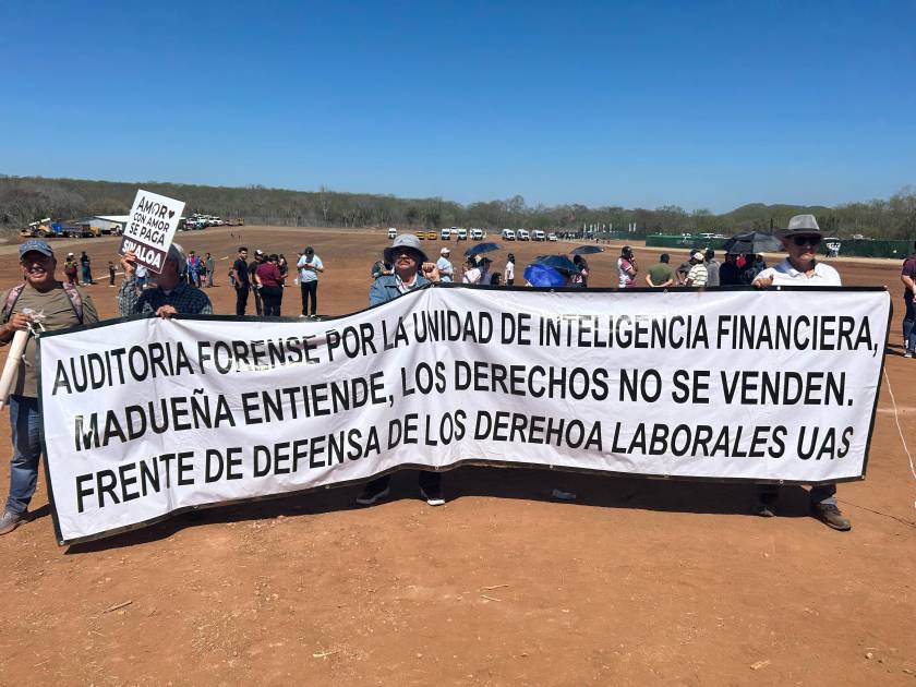 Con el objetivo de hacer visible su lucha, integrantes del Frente de Defensa de los Derechos Laborales de la Universidad Autónoma de Sinaloa se manifestaron este sábado para denunciar lo que califican como un manejo opaco de los recursos universitarios y descuentos a sus pensiones.