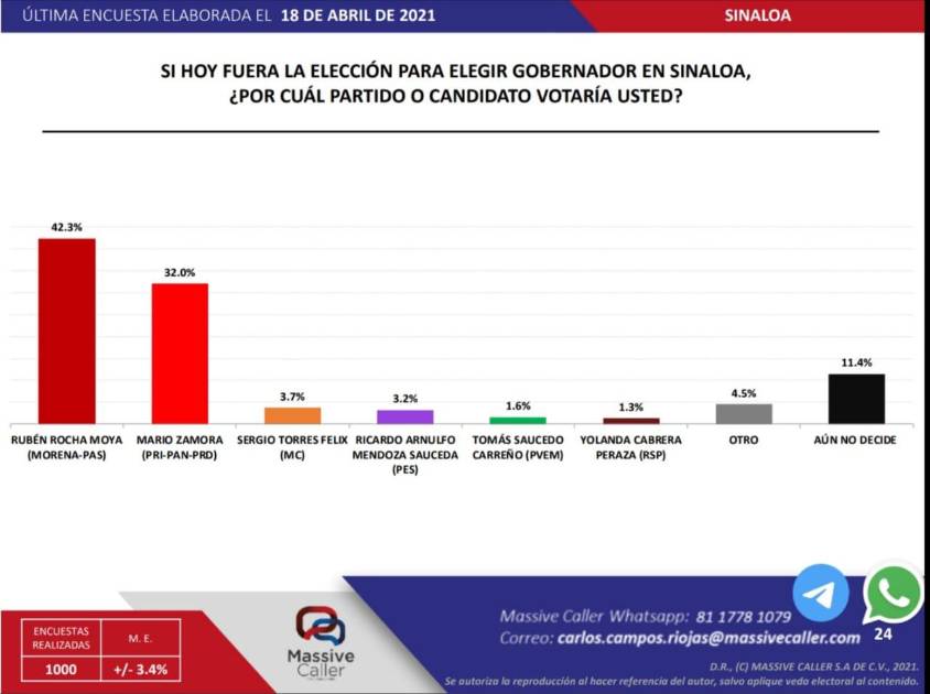En la pasada encuesta publicada el 17 de abril por la empresa Massive Caller, los aspirantes a la Gubernatura, Rubén Rocha Moya por la alianza Morena-PAS y Mario Zamora bajo la alianza PRI, PAN y PRD, tenían una diferencia entre ellos de 9.2 puntos, con los resultados presentados de la más reciente con fecha del 18 de abril, existen 10.3 puntos entre cada uno.