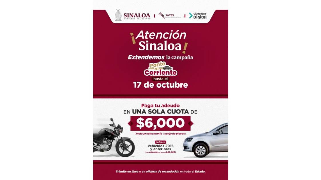 Debido a la buena respuesta de los sinaloenses, el Servicio de Administración Tributaria del Estado de Sinaloa (SATES), amplia el programa “Ponte al Corriente”, que originalmente se llevaría a cabo del 18 de agosto al 19 de septiembre, y que ahora estará vigente hasta el 17 de octubre del presente año.