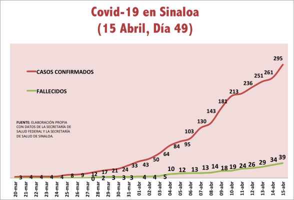 Hay 232 pacientes activos, 39 decesos, 24 recuperados para un total de 295 casos detectados del 28 de febrero al 15 de abril. Adicionalmente hay 459 pacientes sospechosos en los municipios de Ahome, Culiacán, Angostura, Escuinapa, Guasave, Mazatlán, Cosalá, Elota, Rosario, Salvador Alvarado, Sinaloa y Navolato.