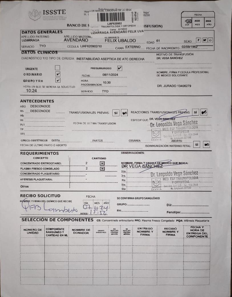 Tres días después de que Félix estuvo en observación, a Ana le dijeron que debían ponerle unidades de sangre a su papá para tratar la anemia; sin embargo, al deber cuatro unidades en el Banco de Sangre, detuvieron la operación hasta que su hija consiguiera el líquido que faltaba.