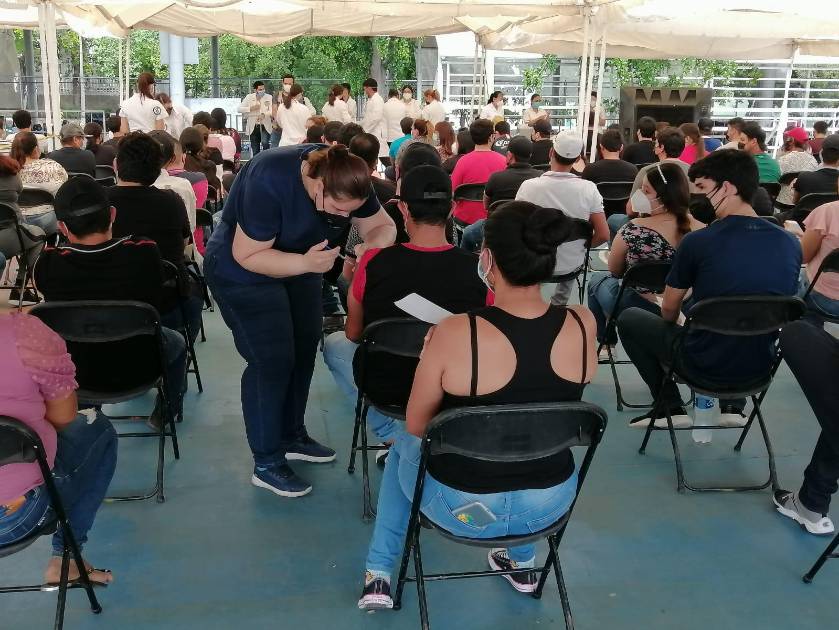 Apenas se están llenando las tres estaciones de espera que se tienen, por lo que el acceso todavía sigue y los jóvenes esperan en el calor la aplicación de su primera dosis de la marca Sinovac.