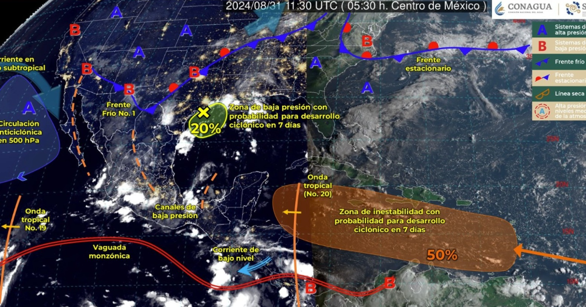 Así, para este sábado, indica, el Frente Frío número 1 interactuará con el monzón mexicano y con un canal de baja presión sobre el norte del País, lo cual originará lluvias muy fuertes a puntuales intensas en zonas del noroeste, norte y noreste de México,