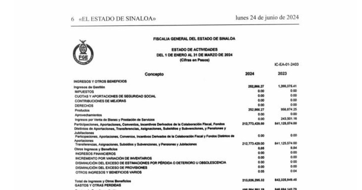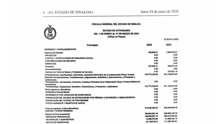 La Fiscalía General del Estado de Sinaloa incrementó su gasto operativo en comparación entre los primeros trimestres del 2023 y 2024, de acuerdo al avance financiero de la institución. El incremento fue de 12 millones 941 mil 299.21 pesos.