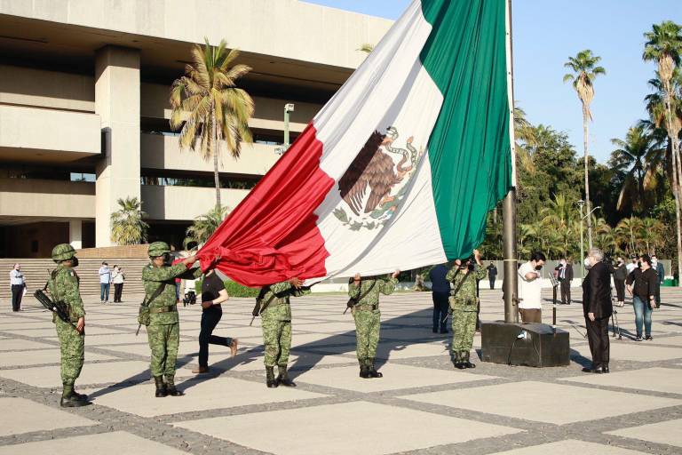 El evento, que tuvo lugar en la explanada del Palacio de Gobierno constó de un izamiento de bandera a media asta, y honores al lábaro patrio, precedido por el Gobernador Rubén Rocha Moya.