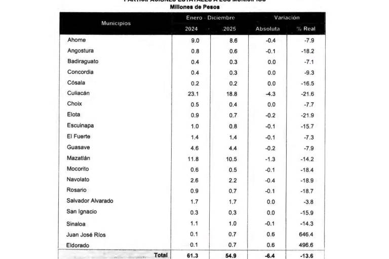 Mazatlán también registró una reducción en los recursos recibidos, al pasar de 11.8 millones de pesos en 2024 a 10.5 millones en 2025, con una caída absoluta de 1.3 millones de pesos y una variación real negativa de 14.2 por ciento. En el caso de Ahome, las participaciones estatales disminuyeron de 9.0 a 8.6 millones de pesos, lo que significó una reducción real de 7.9 por ciento.