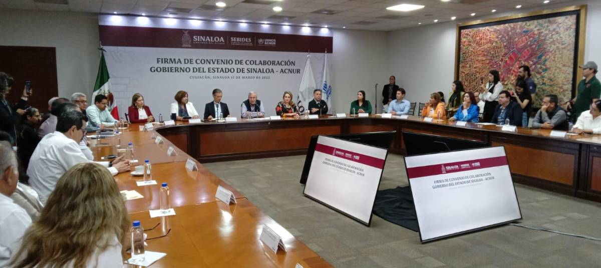 En el evento de firma de convenio estuvieron presentes el representante del Alto Comisionado de la ONU en México, Geovanni Lepri, y el Gobernador Rubén Rocha Moya, acompañado de su gabinete.
