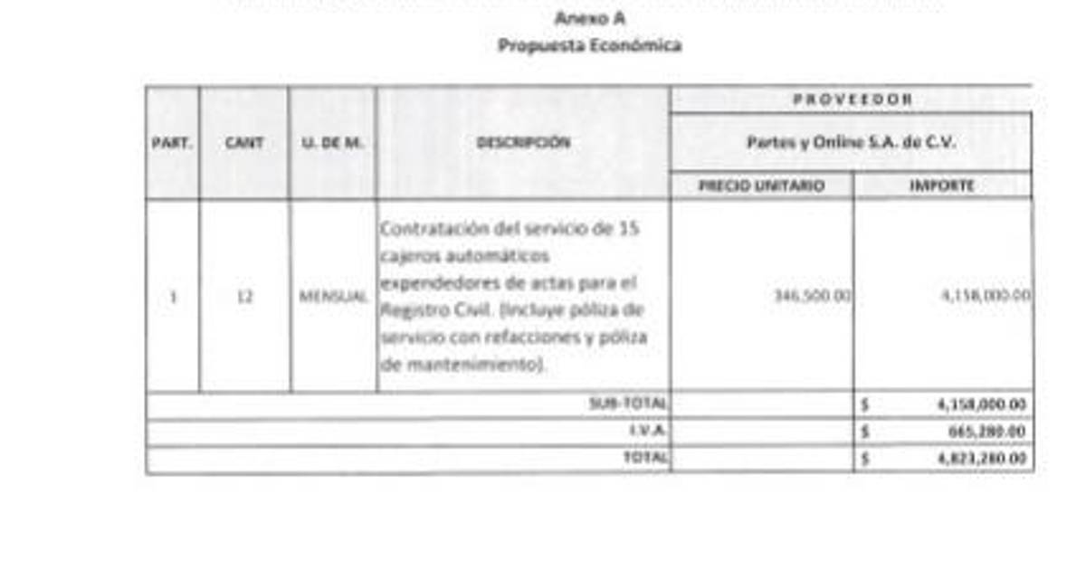 La empresa Partes & Online S.A de C.V se llevó el contrato de la licitación pública GES 25/2023 por un precio unitario de 346 mil 500 pesos por cajero automático, siendo la única empresa que ofertó en el concurso.