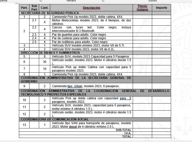 CULIACÁN._ El Gobierno de Sinaloa, a través de la Secretaría de Administración y Finanzas, comenzó el proceso de licitación para adquirir 67 vehículos modelo 2023 con distintas características, entre los que se encuentran cuatro motocicletas, para diversas áreas y dependencias.