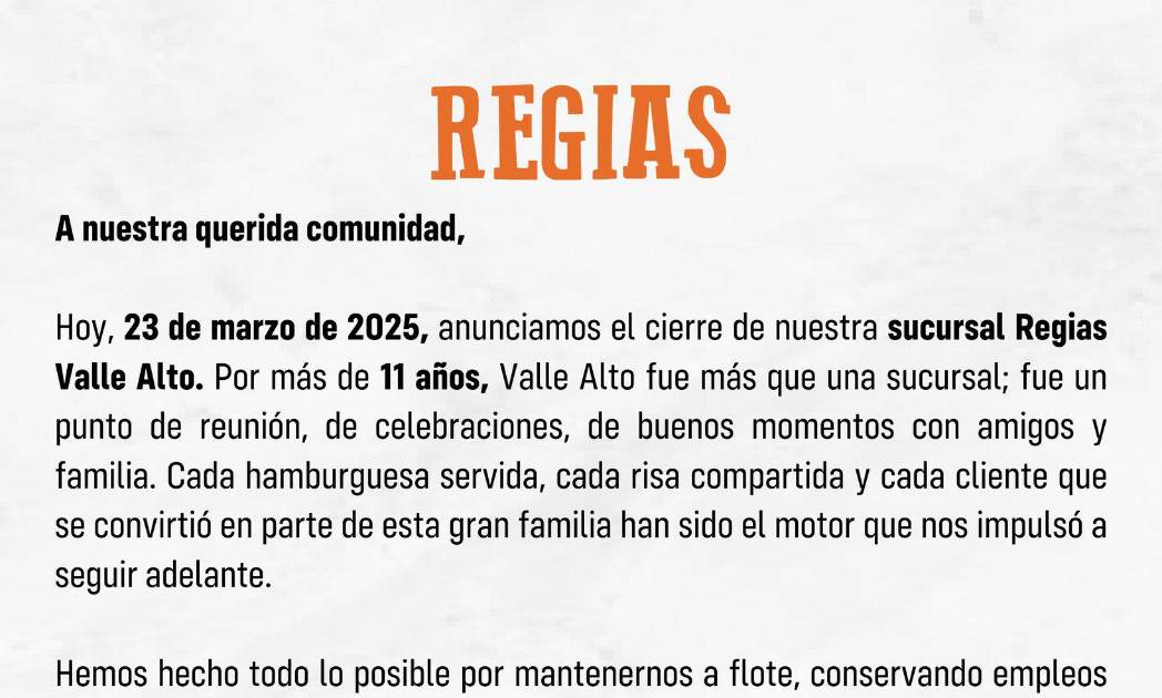 “Por más de 11 años, Valle Alto fue más que una sucursal; fue un punto de reunión, de celebraciones, de buenos momentos con amigos y familia. Cada hamburguesa servida, cada risa compartida y cada cliente que se convirtió en parte de esta gran familia han sido el motor que nos impulsó a seguir adelante”, se señala en el comunicado compartido en las redes sociales de la empresa.
