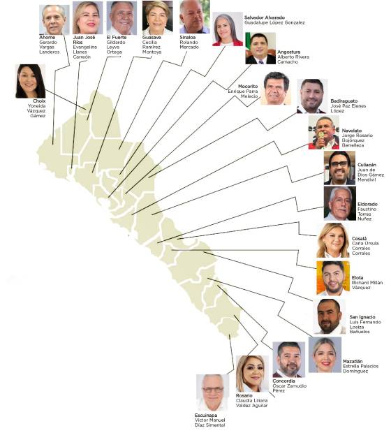En cuanto a las alcaldías morenistas, estas son las de Ahome, Badiraguato, Concordia, Culiacán, El Fuerte, Guasave, Mocorito, Rosario, Salvador Alvarado, San Ignacio, Sinaloa Municipio y Eldorado; mientras que las que fueron en alianza Morena-Partido Verde fueron Juan José Ríos, Cosalá y Mazatlán.