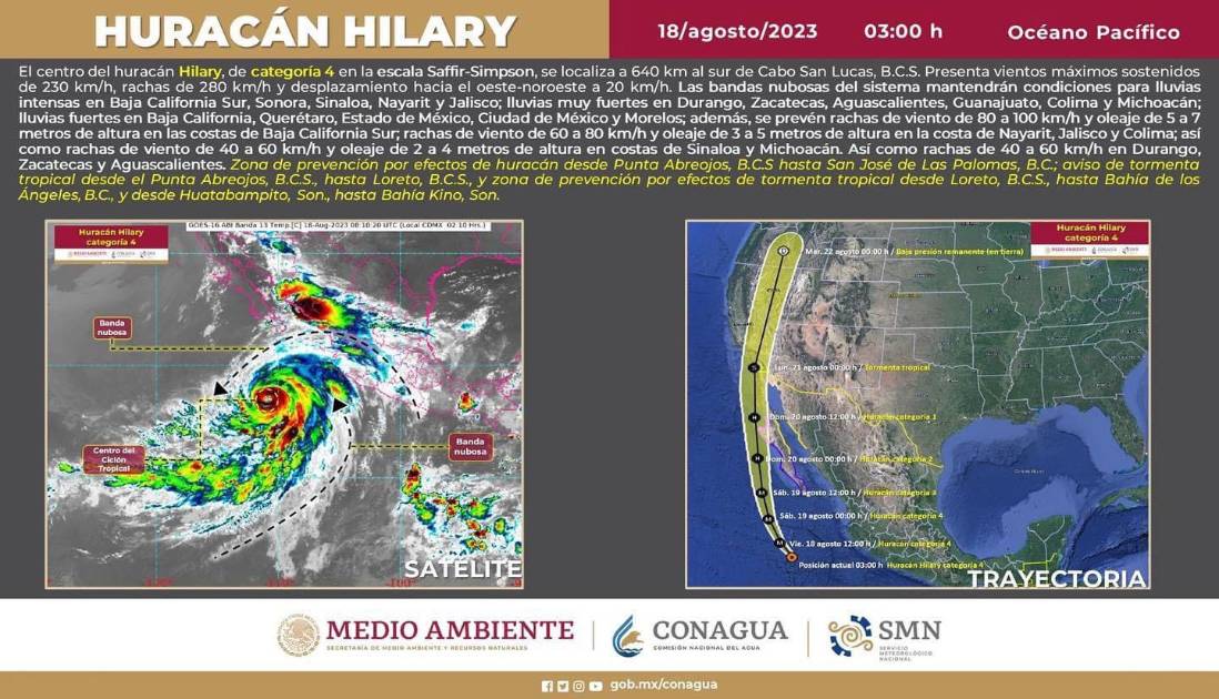 El huracán Hilary, de categoría cuatro con vientos de 233 kilómetros por hora, provocará lluvias fuertes y moderadas en Sinaloa, según el Instituto Estatal de Protección Civil.