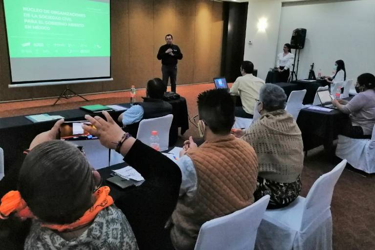 El taller corrió a cargo de Melissa Cháidez Castaños y Javier Moro Hernández, Coordinadora Técnica y Enlace con los Estados, respectivamente, del Núcleo de Organizaciones de la Sociedad Civil para el Gobierno Abierto en México.