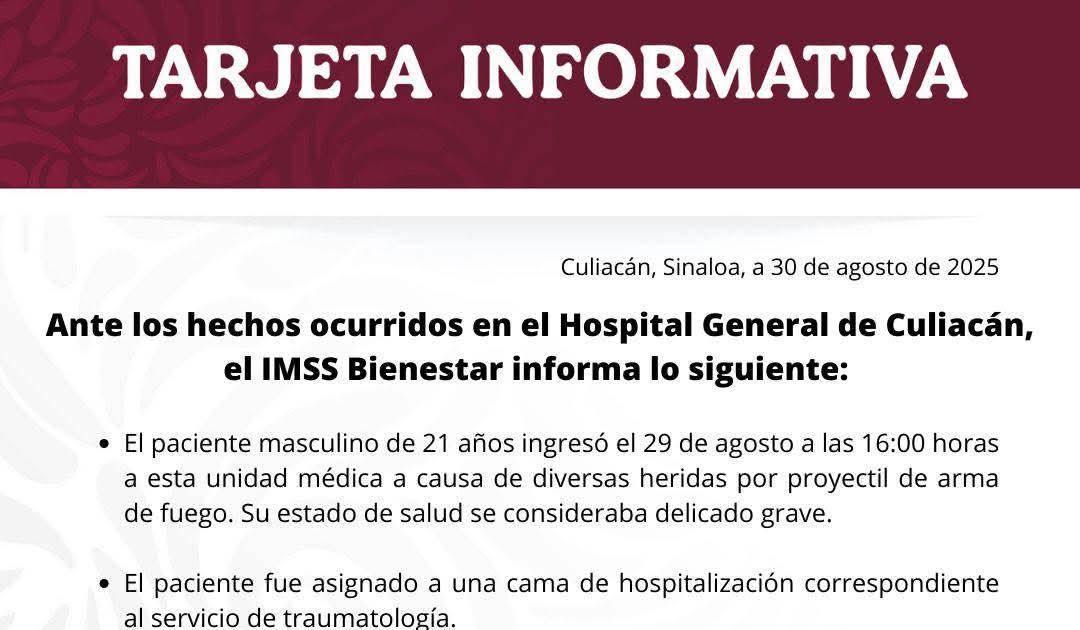 A través de un comunicado, el IMSS Bienestar aseguró que colabora de manera activa con las autoridades ministeriales para esclarecer el asesinato registrado dentro de sus instalaciones la tarde de este sábado 30 de agosto y que el Hospital General de Culiacán mantiene la operación normal de sus servicios.
