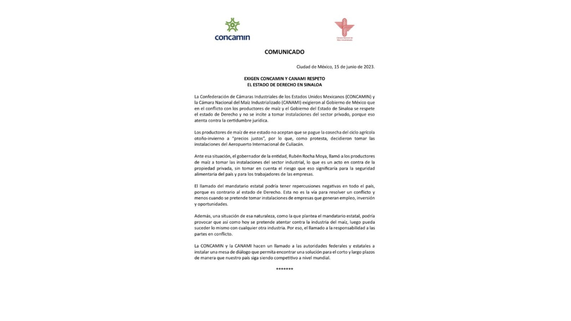A respetar el Estado de Derecho en la entidad pidieron la Concamin y la Canami al Gobernador Rubén Rocha Moya, luego de que el Mandatario estatal desafiara a productores a dejar el Aeropuerto Internacional de Culiacán y a tomar las plantas de Gruma, Minsa y Cargill.