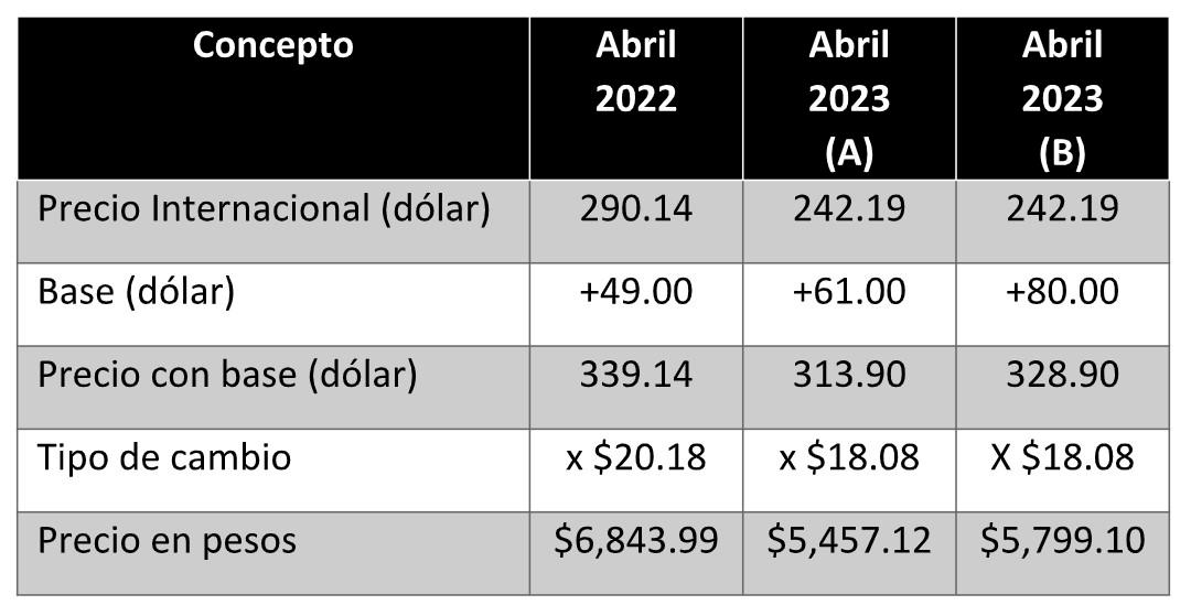 También se les presentó a los productores las perspectivas de los precios del maíz en el presente año y su comparativo con el anterior, donde en la tabla se puede observar la diferencia significativa que hay entre los precios al 21 abril del 2022 contra el 21 de abril del 2023, mediante dos escenarios. En el primer escenario columna (A) se presenta el precio internacional de 241.19 dólares al 21 de abril, con una base de 61 dólares que es la que originalmente propuso Segalmex en febrero de este año, pero que fue rechazada por los productores. En el segundo escenario, con la columna (B) se presenta el mismo precio al cierre de la semana, pero ahora con una base de 80 dólares que es calculada usando los destinos y los precios de indiferencia de las principales regiones compradoras del maíz sinaloense. Por lo que en el peor de los casos podemos suponer $5,457 pesos por tonelada de maíz, alrededor de 1,300 pesos menos que el año pasado. En el mejor de los casos se puede estimar un precio de alrededor de $5,800 pesos por tonelada, un poco más de 1,000 pesos por tonelada menos que el año pasado.