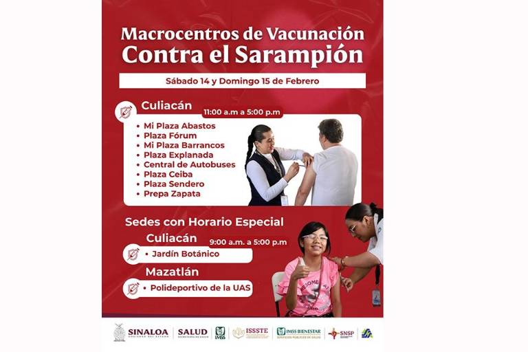 La Secretaría de Salud de Sinaloa anunció la instalación de macrocentros de vacunación contra el sarampión en distintos puntos de Culiacán y Mazatlán, con el objetivo de ampliar la cobertura y proteger a la población contra esta enfermedad.