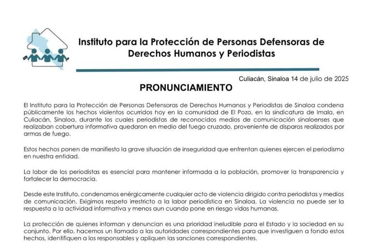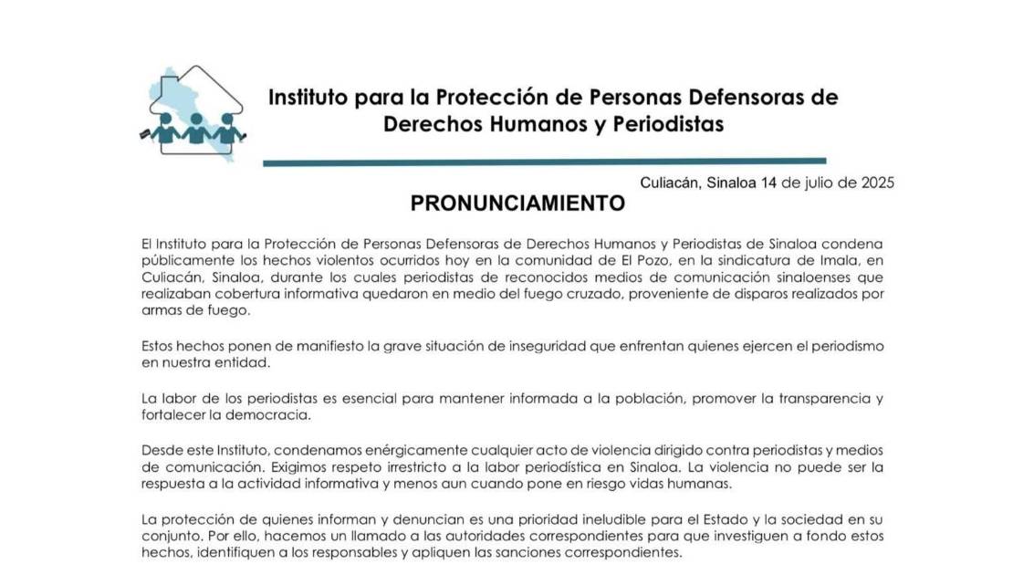 CULIACÁN._ El Instituto para la Protección de Personas Defensoras de Derechos Humanos y Periodistas de Sinaloa condenó públicamente los hechos violentos ocurridos este 14 de julio en la comunidad de El Pozo, sindicatura de Imala, donde periodistas de la fuente de seguridad que cubrían un evento informativo quedaron atrapados en fuego cruzado.