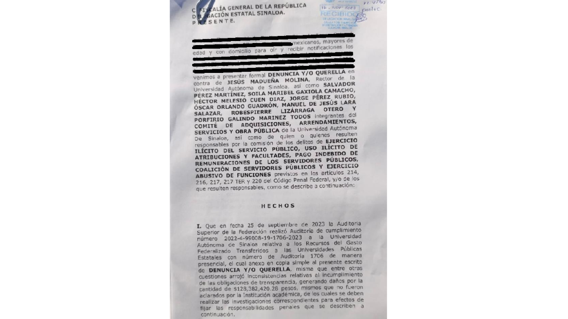 Tras las observaciones de la Auditoría Superior de la Federación a la cuenta pública de la Universidad Autónoma de Sinaloa, en el cual se detectó un daño a las finanzas por 128 millones de pesos, universitarios interpusieron una denuncia ante la Fiscalía General de la República contra el ex Rector Jesús Madueña Molina y los integrantes del Comité de Compras de la Universidad.