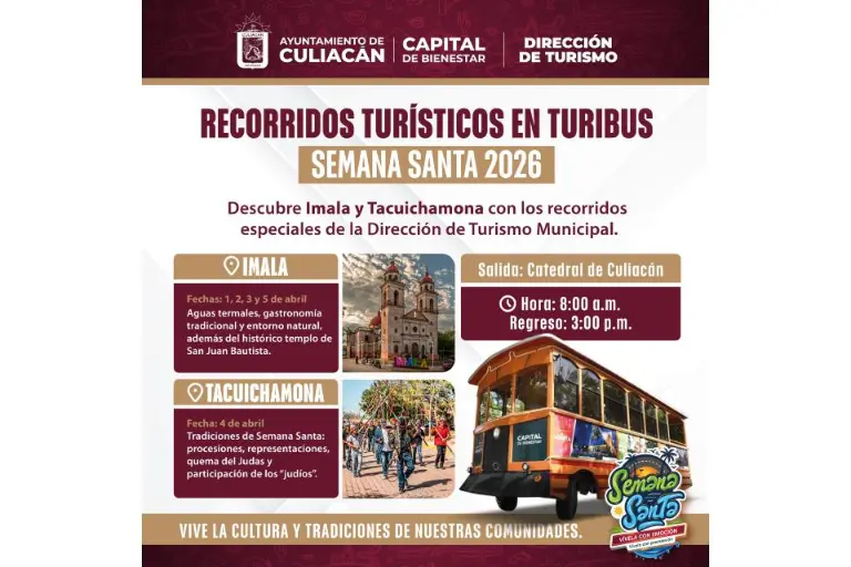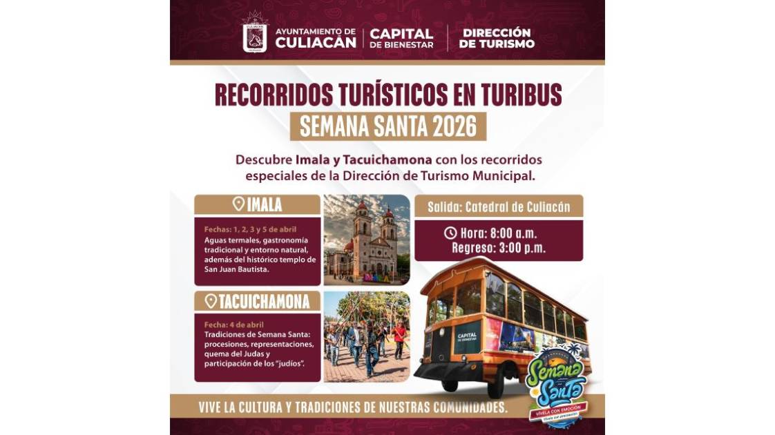 Invita Ayuntamiento de Culiacán a recorridos en Turibús a Imala y Tacuichamona por Semana Santa