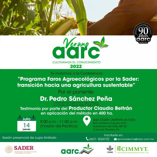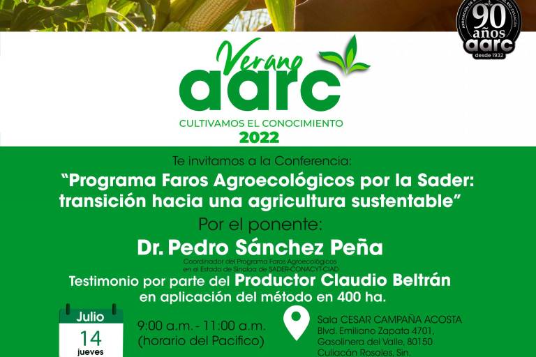 La Asociación de Agricultores del Río Culiacán extiende la invitación para la Primer Conferencia de VERANO AARC 2022 este próximo jueves 14 de Julio de 2022 de 09:00 a 11:00 a.m. con tema “Programa Faros Agroecológicos por la SADER: Transición hacia una Agricultura Sustentable” impartida por el Ponente Dr. Pedro Sánchez Peña, Coordinador del Programa Faros Agroecológicos del Estado de Sinaloa de SADER-CONACYT-CIAD. El Programa incluye asesoría técnica durante el ciclo agrícola.