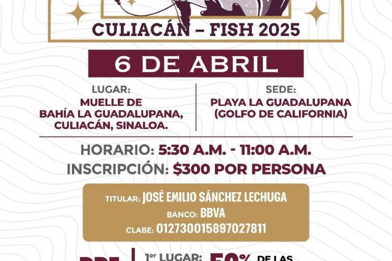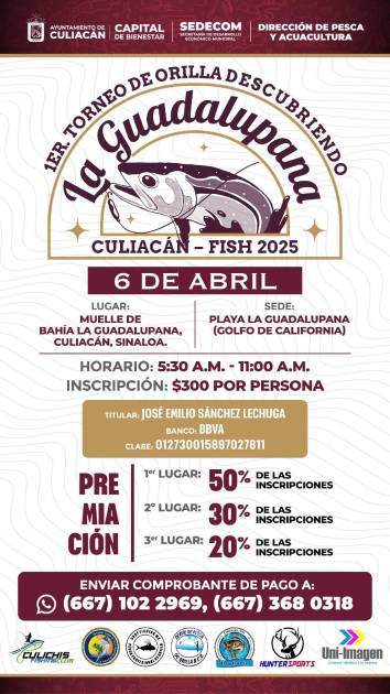 El torneo ‘Descubriendo la Guadalupana, Culiacán-Fish 2025’ se realizará el próximo 6 de abril en punto de las 5:30 horas y hasta las 11:00 horas.
