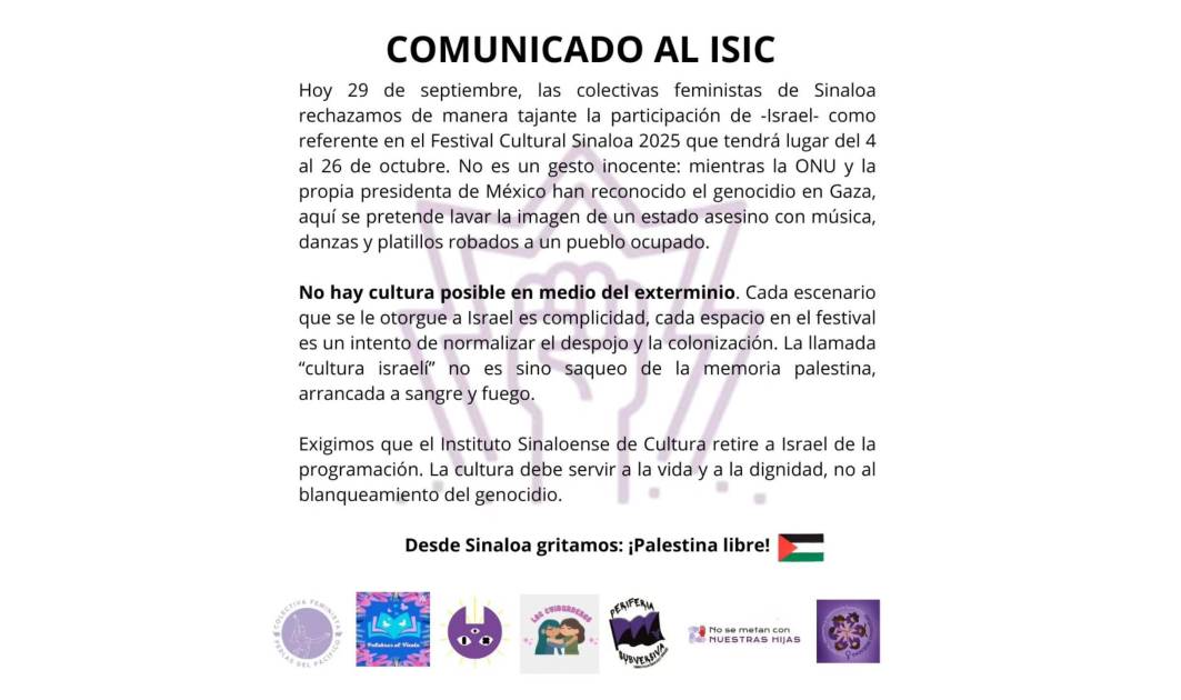 “Hoy 29 de septiembre, las colectivas feministas de Sinaloa rechazamos de manera tajante la participación de -Israel- como referente en el Festival Cultural Sinaloa 2025 que tendrá lugar del 4 al 26 de octubre. No es un gesto inocente: mientras la ONU y la propia presidenta de México han reconocido el genocidio en Gaza, aquí se pretende lavar la imagen de un estado asesino con música, danzas y platillos robados a un pueblo ocupado”, puede leerse en el posicionamiento que fue publicado en redes sociales.