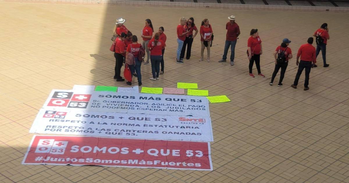 Jubilados del SNTE 53 exigen en Palacio de Gobierno pagos de interinatos