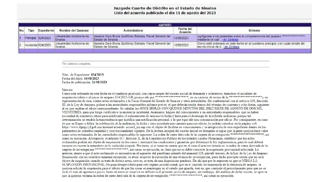 Un Juez federal le negó la suspensión provisional a la Universidad Autónoma de Sinaloa contra una orden y ejecución de cateo por parte de la Fiscalía General del Estado, esto bajo el cuadernillo 824/2023 en el Juzgado Cuarto de Distrito.