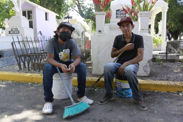 Desde hace algunos años Kevin Daniel de 17 años y su hermano Alejandro de 13 años, trabajan en el Panteón Civil los días previos al Día de Muertos, limpiando tumbas para ganar un poco de dinero que les permita aportar al sustento de su hogar.