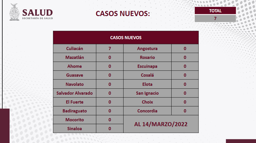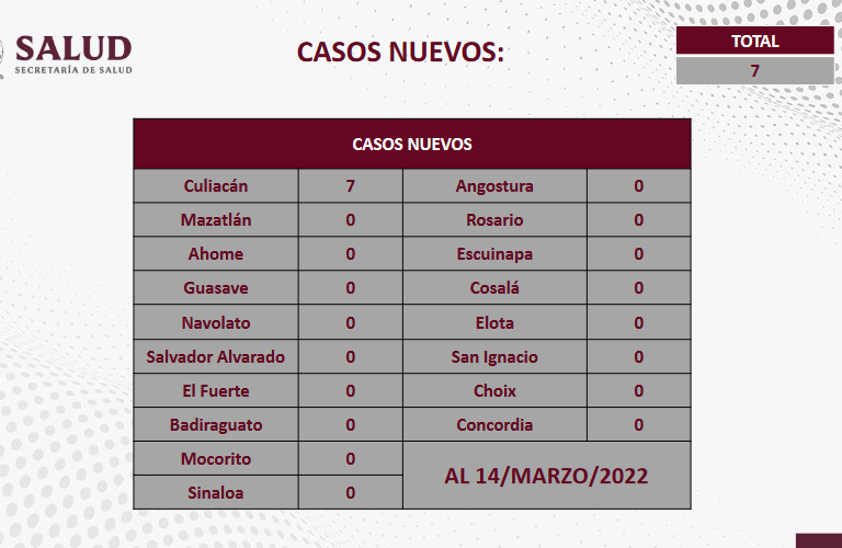 La Secretaría de Salud en Sinaloa reporta solo 7 casos nuevos de Covid; hay 539 pacientes enfermos