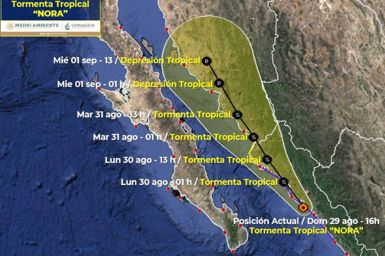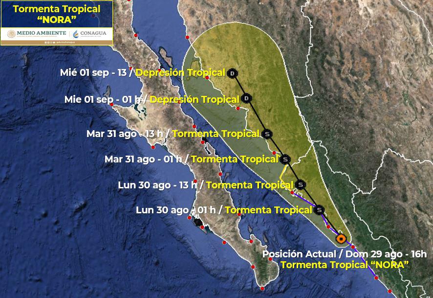 La tormenta tropical Nora se ubicó esta tarde a 55 kilómetros de Altata, en la parte central de Sinaloa y sigue moviéndose hacia el norte, muy pegado a la costa.