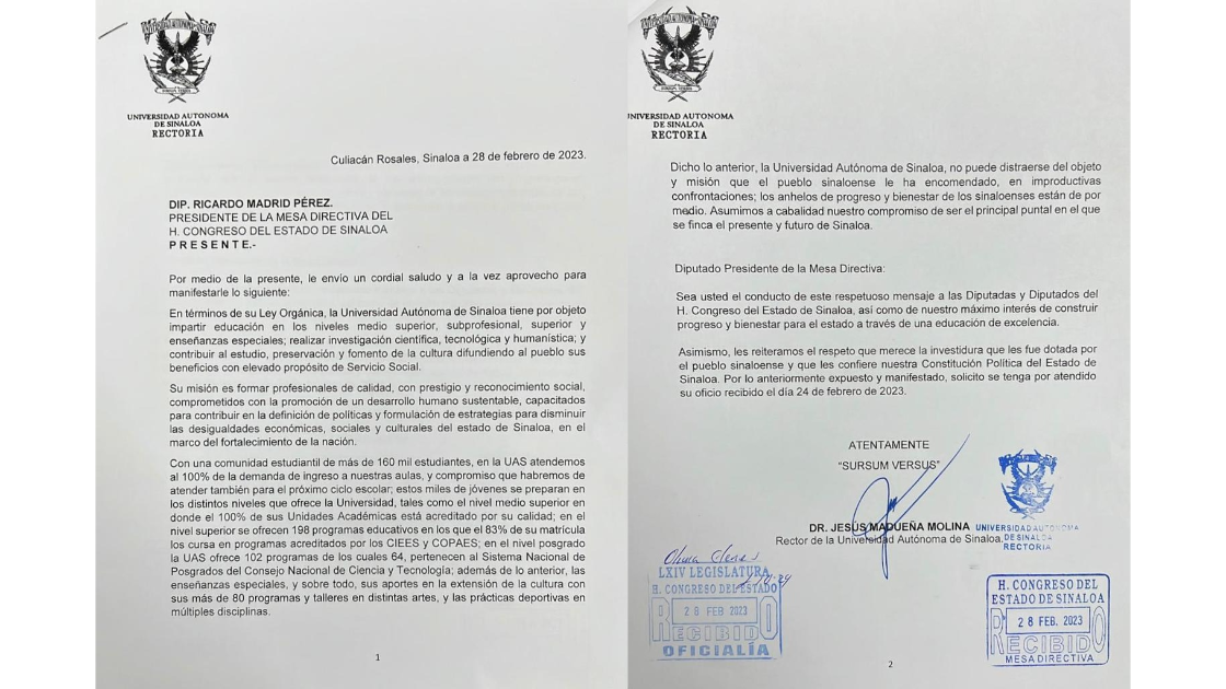 “La Universidad Autónoma de Sinaloa no puede distraerse del objeto y misión que el pueblo sinaloense le ha encomendado, en improductivas confrontaciones; los anhelos de progreso y bienestar de los sinaloenses están de por medio. Asumimos a cabalidad nuestro compromiso de ser el principal puntal en el que se finca el presente y futuro de Sinaloa”, señala el comunicado enviado al Congreso.
