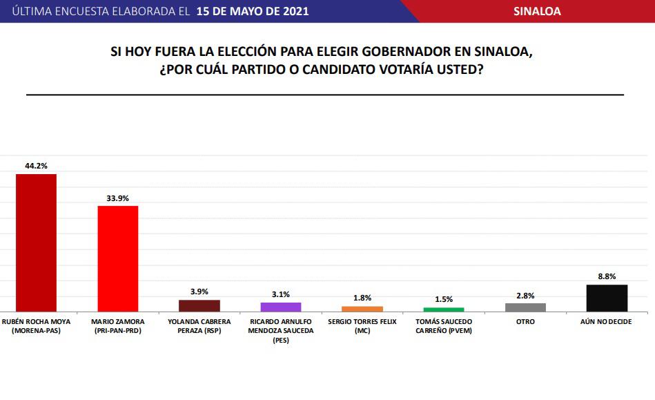 Con una diferencia de 10.3 puntos porcentuales se mantiene el candidato a la Gubernatura en Sinaloa, Rubén Rocha Moya, de la coalición Morena-PAS, sobre Mario Zamora Gastélum, de la alianza PRI, PAN y PRD, de acuerdo a la más reciente encuesta telefónica de la empresa Massive Caller, del 15 de mayo.