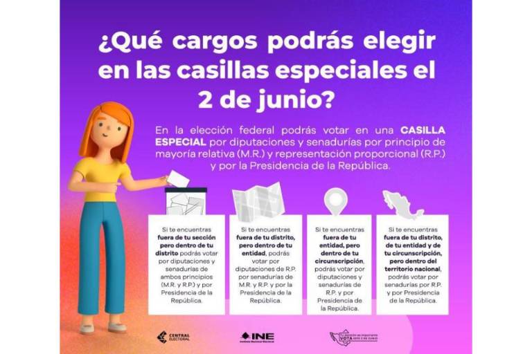 De acuerdo con el Instituto Nacional Electoral, en la elección federal se podrá votar en una casilla especial por diputaciones y senadurías por principio de mayoría relativa, MR, implica que se vota directamente por la persona que se desea como representante, ya sea para una diputación o una senaduría.