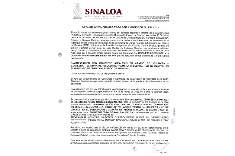 El ganador del concurso fue la empresa Constructora Bogax, representada por Manuel Octavio Borboa Robles, misma que ha conseguido quedarse con anteriores licitaciones como la pavimentación del Boulevard de acceso al Aeropuerto de Culiacán.