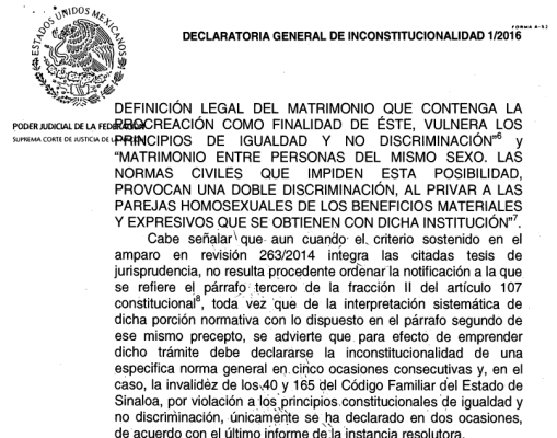 De acuerdo con la tesis de jurisprudencia 43/2015 que emitió la Suprema Corte de Justicia de la Nación en marzo del 2015, todos aquellos códigos civiles que tengan en su redacción que el matrimonio sólo es aquel que surge de la unión entre un hombre y una mujer son inconstitucionales, tal como se establece en los artículos 40 y 165 del Código Familiar de Sinaloa.